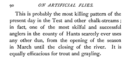 In Halford's time the Gold Ribbed Hare's Ear (GRHE) was, and continues to be, a very effective pattern. It doesn't look like any natural fly. Halford added wings to make it acceptable to dry fly purists, without any deterioration in its attractiveness to trout. In this comment from his 1886 book Halford recognized its effectiveness.