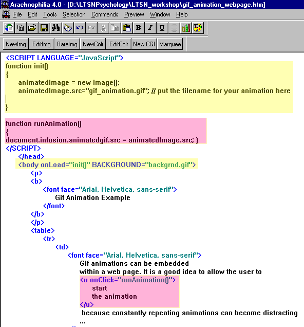 Scroll down the screen to reveal the HTML code that inserts the animated gif background image <img src="animated_gif_background.gif" ...> on the web page. This static image is displayed when the page is loaded. Notice that