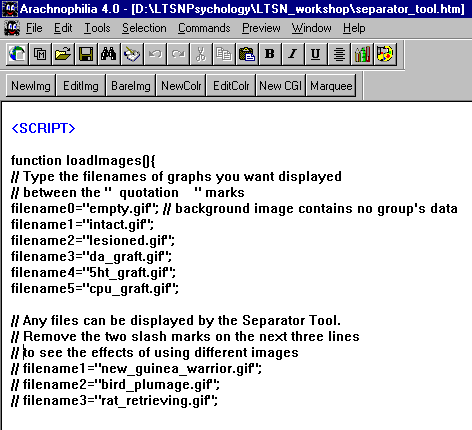 Launch the HTML editor Macromedia Dreamweaver. Open the file separator_tool.htm. Use the commands Edit, Launch External Editor on the drop-down menu bar to view the HTML code in the HTML text editor Arachnophilia. |