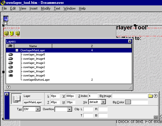 Use Window, Layers and Windows, Properties on Dreamweaver's drop-down menus to examine the layers that are used to control the position of various layers on the web page. Use Arachnophilia to find the line:<div id="OverlayerMainLayer" style="position:absolute; width:882px; height:440px; ......"> which controls the position of OverlayerMainLayer Use