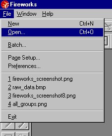 Launch the Macromedia Fireworks application. Use Firework's File, Open.. menu to open raw_data.bmp in Fireworks (File, Open)