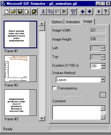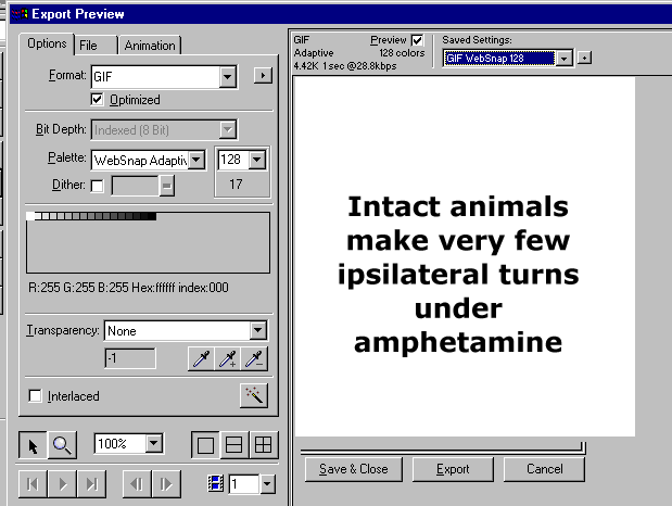 Create a totally blank image of exactly the same size as the results image files (use Select, All, Edit, Cut from Firework's drop-down menu bar). Use the text tool to add the following comment "Intact animals make very few ipsilateral turns under amphetamine". Save this file with the name intact_comment.png Create a series of blank images with the following comments and save them with the indicated filenames: