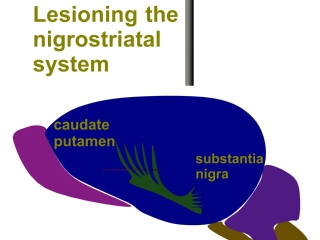 In humans, Parkinson's disease is associated with a profound loss of dopamine (DA) in the nigrostriatal system. In rats, nigrostriatal lesions destroy a major DA pathway in the brain. Therefore nigrostriatal lesions have been used as an animal model of Parkinson's disease. The following diagrams show a wire electrode being lowered into the brain. Then a small electrical current is passed down the wire to destroy the area around the tip of the electrode.