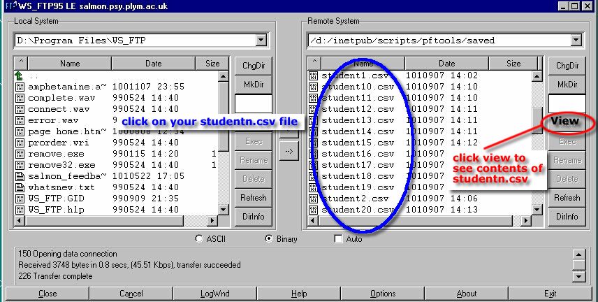 In order to view your results you must use WS_FTP to connect to salmon.psy.plym.ac.uk which is the computer which contains all the results files. Note that results files and HTML files are stored on different remote computers.