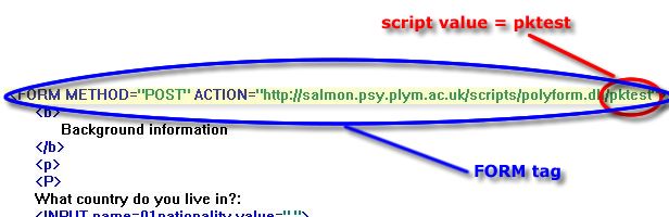 The FORM tag instructs the page to execute a PolyForm script (set of instructions) when the user clicks the Submit button on the web page. In this example the script has the name 'pktest'. The instructions executed by the script are stored on a computer called 'salmon.psy.plym.ac.uk'. PolyForm is the name of the programme on salmon.psy.plym.ac.uk that executes the commands contained in a script.