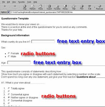 Now that you have read how to do it you may want to download and save a template questionnaire with blanks for you to fill in. The template contains several examples of radio buttons and free text entry boxes.