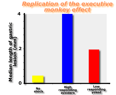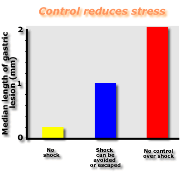 The important finding is that rats with no control over shock delivery had significantly greater stomach ulceration than rats that received exactly the same amount of electric shock but were able to avoid or excape from it.
