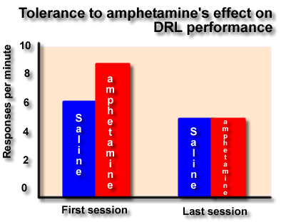 One explanation for the different effects of amphetamine on DRL performance and motor activity is that tolerance to a drug only occurs when the drug causes a reduction in reinforcement density. In other words tolerance only develops when the drug reduces the number of food rewards received by the animal.