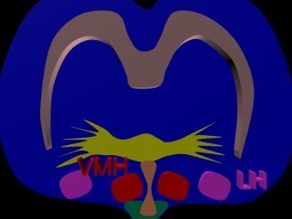 Lesions to the VMH and LH produced the most straightforward and startling effects. This animation should help you visualize the location of the centres within the brain. As you examine the path taken by the lesioning electrodes consider how much 'collateral damage' is involved. How you would design an experiment to rule out the possibility that the effects of the lesion were in fact due to 'collateral damage' rather than destruction of a particular hypothalamic nuclei?