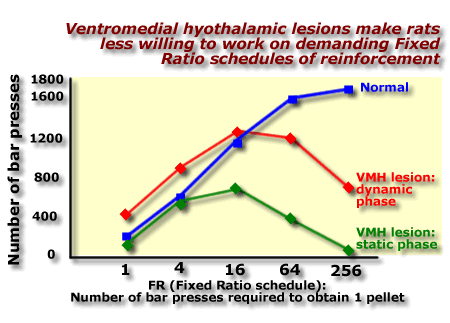 These are not the behaviours you might expect if the VMH is a hunger centre whose destruction increases an animal's motivation for food! These animal experiments appear to correspond to the observation that - compared to normal weight people - obese humans eat fewer peanuts if they have to shell them. |
