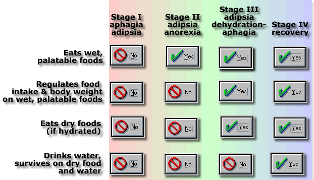 The diagram below shows that initially, animals with lateral hypothalamic lesions exhibit severe loss of body weight due to their refusal to eat ( aphagia ) and drink ( adipsia ). But these effects are not permanent. Body weight does not decline inexorably. The table shows that rats go through 4 stages of recovery after LH lesions. Dual point theory cannot explain these results. |