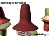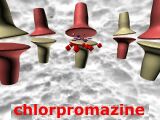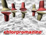 Antipsychotic drugs such as chlorpromazine are thought to exert their therapeutic effects by blocking DA receptors. Here are some images from a movie showing this effect of chlorpromazine on postsynaptic receptors. Notice that chlorpromazine attaches to receptor sites in the postsynaptic membrane normally occupied by dopamine released from the presynaptic neuron. This prevents dopamine activating these receptors and consequently the postsynaptic neuron does not fire.