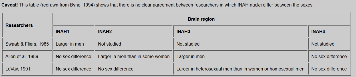 There are four interstitial nuclei of the anterior hypothalamus (INAH) in the human brain that may be homologues (similar in structure and evolutionary origin) of the rat's sexually dimorphic nuclei (SDN).
