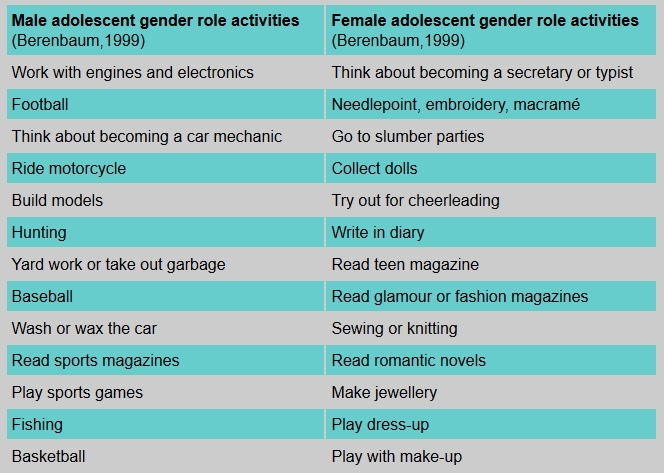 Berenbaum (1999) has shown clear differences in activities and job interests between adolescent boys and girls.