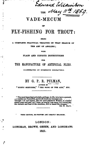 George Pulman had a tackle shop in Totnes, a town in South Devon on the banks of the River Dart. Pulman gets a good press from fly-fishing historians; some even propose that he was the first to suggest fishing with dry flies. Less well known is his advice in 1851 to fish with two flies, a 'drop' fly on the surface, together with an underwater 'stretcher' fly.