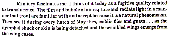 Pete Hidy (1973) commented on this photograph: "the use of certain dubbings and hackles can create the phenomenon that I identify as mimicry because it goes beyond, but is related to, the quality of translucence" Hidy added mimicry to a list of features that convey life to an artificial fly: Undercolour, Translucence, Texture, Shape, Proportions, Delicacy, and Vitality, but acknowledged that the artificial only needed to incorporate one or two of these features: "as shown by the nymph imitations of two English anglers, Stewart and Kite".