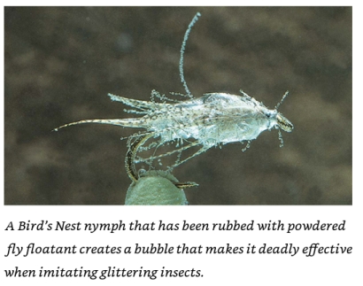 Fish Food (2005) to the range of insects that display gas bubbles.He describes how to create gas bubble effects in artificial flies, and how to present them to trout. He introduces Chapter 9 All That Glitters as follows: