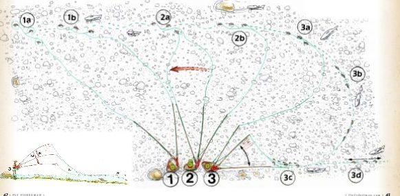 During a rise the trout's body tilts upwards. Maintaining this fixed angle of approach (i.e. a Tizzy angle of 40 degrees) throughout the rise