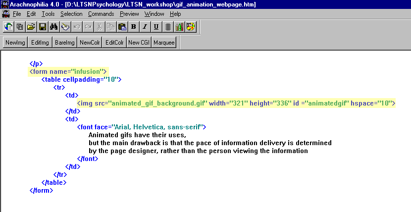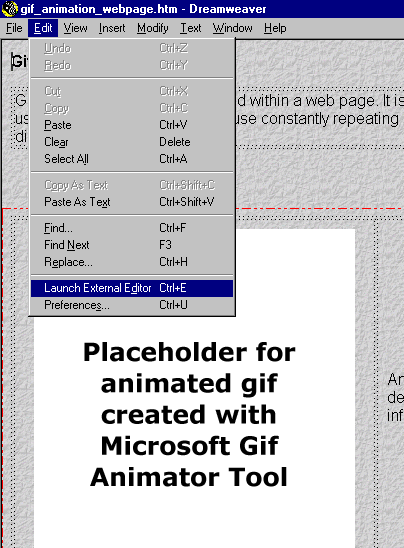 Launch the HTML editor Macromedia Dreamweaver. Open the file gif_animation_webpage.htm Use the commands Edit, Launch External Editor on the drop-down menu bar to view the HTML code in the HTML text editor Arachnophilia. |