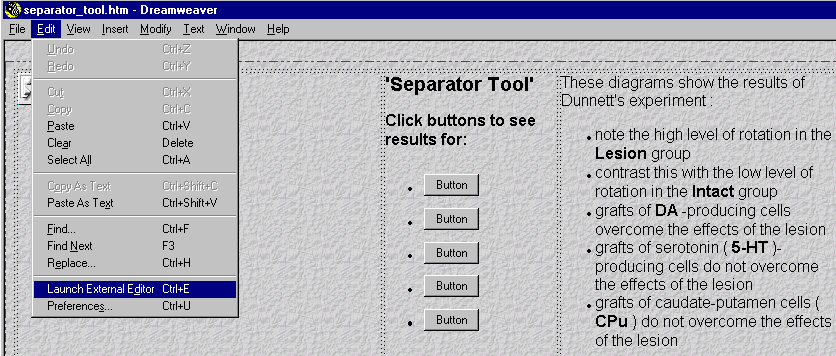 Launch the HTML editor Macromedia Dreamweaver. Open the file separator_tool.htm. Use the commands Edit, Launch External Editor on the drop-down menu bar to view the HTML code in the HTML text editor Arachnophilia. |