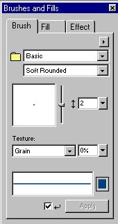 Select Window, Brush from Fireworks' drop down menu bar to launch Firework's Brush & Fill tool. Use a Basic brush, Soft rounded line with Brush tip size set to a value of 2. Use