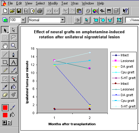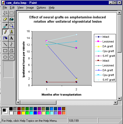 The file 'raw_data_day1.xls' (in the LTSN resources folder) contains simplified raw data from an experiment described by Dunnett (1989) on the effect of various neural grafts on amphetamine-induced rotation after unilateral nigrostriatal lesion. The data has been used to create a simple line graph showing the performance of five independent groups of animals. You can use this file for today's activities. Create a simple line chart of the results as follows: