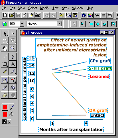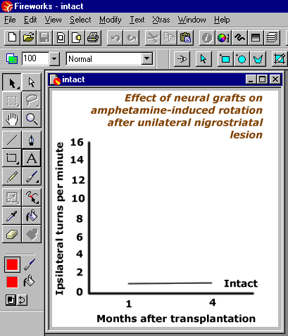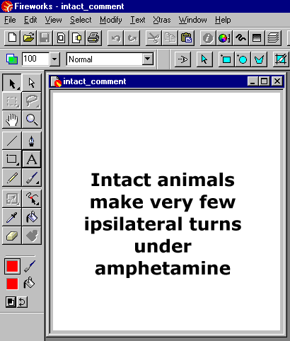 Create a totally blank image of exactly the same size as the results image files (use Select, All, Edit, Cut from Firework's drop-down menu bar). Use the text tool to add the following comment "Intact animals make very few ipsilateral turns under amphetamine". Save this file with the name intact_comment.png Create a series of blank images with the following comments and save them with the indicated filenames: