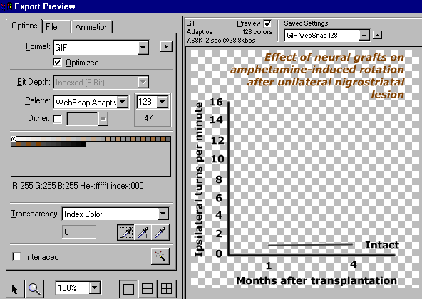 Open the file intact.png in Fireworks and export and select File, Export from the drop-down menu. Use the eyedropper icon to select a colour that will become transparent. Click on a white area of the graph. Check that white is rendered transparent. The white are of your image will be shown as a grey and white checkerboard pattern. Save this file with the name transparent_intact.gif. Repeat this process for all your results gif image files |