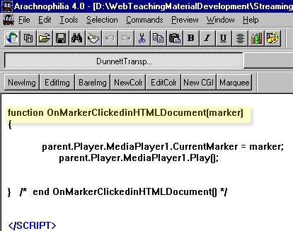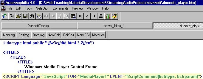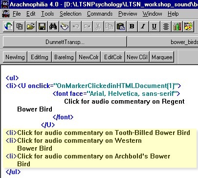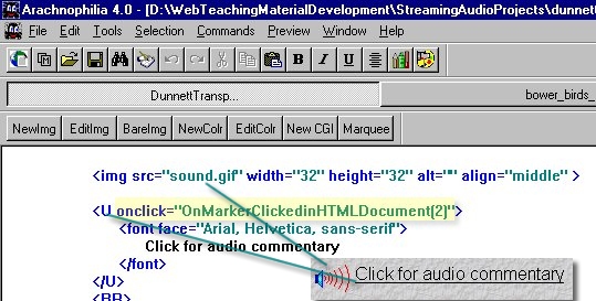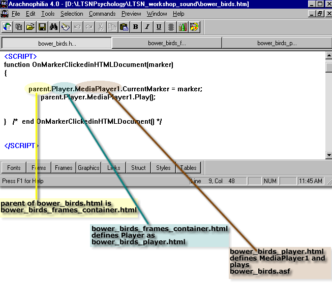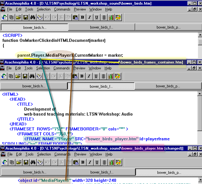 If necessary open the file bower_birds.htm in a text based HTML editor such as Arcachnophilia. You need to appreciate that parent.Player.MediaPlayer1 referred to by the JavaScript function OnMarkerClickedinHTMLDocument() in the document bower_birds.htm refers to an object called MediaPlayer1 . The term parent.Player describes how to find MediaPlayer1. The file bower_birds.htm passes a parameter (marker) to parent.Player.MediaPlayer1. But the actual object MediaPlayer1 exists in a different document. The route to the object involves going back to the parent of the document bower_birds.htm. Inside the parent document is a reference to an object called Player. In this case the Player object is the document bower_birds_player.html which contains an object called MediaPlayer1 |