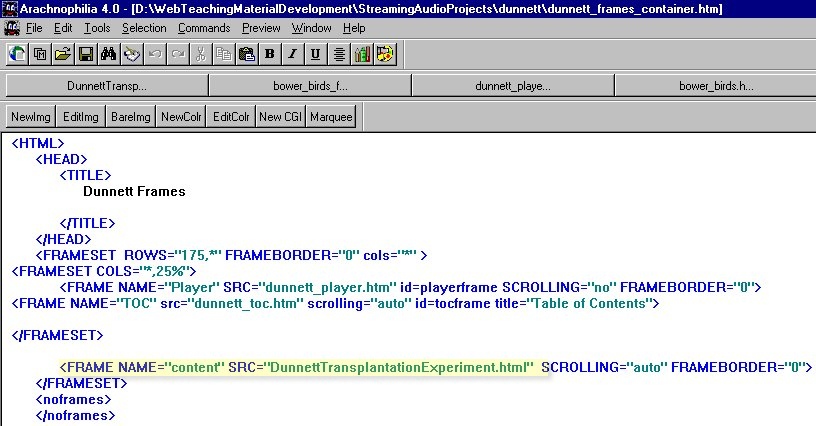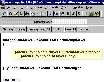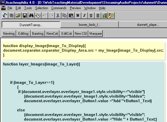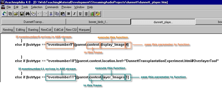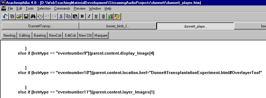 You should be familiar with the format of the code that processes "eventnumber10" in the ASF stream. When "eventnumber10" arrives, the user is shown the section of the web page named OverlayerTool in the web page DunnettTransplantationExperiment.html The techniques used to deal with "eventnumber9" and "eventnumber11" may be unfamiliar. When MediaPlayer1 encounters "eventnumber9" in the stream it passes the value 4 to the function called display_Image() in a Frame named "content" When MediaPlayer1 encounters "eventnumber11" in the stream it passes the value 1 to the function called layer_images() in a Frame named "content" |
