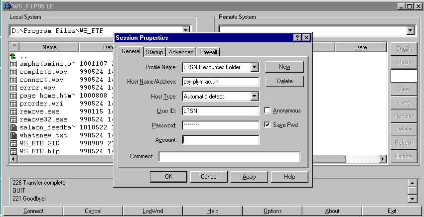 Set up a New Session in WS_FTP to connect to the LTSN Resources Folder using the following Session Properties: