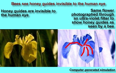 Some insect eye's are sensitive to ultraviolet light and respond to the honey guides. The important point about this example is that it shows us that animals may not necessarily perceive the world the way we do. |