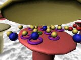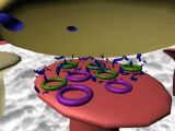 In this simulation chlorpromazine is injected first and occupies postsynaptic receptor sites. Then amphetamine is injected. This mimics the arrival of an action potential at the nerve ending and causes the release a large number of DA molecules from the presynaptic neurone. But this released DA cannot activate the postsynaptic receptors because they are occupied by chlorpromazine molecules. Consequently, the postsynaptic neurone does not generate an action potential. The released DA is broken down by enzymes in the synaptic cleft, or is reabsorbed into the presynaptic neurone.