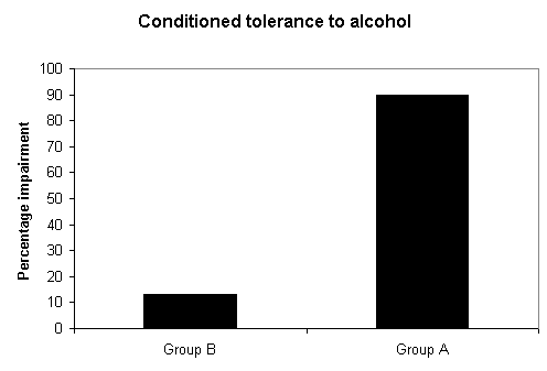 This next figure shows the degree of disruption caused by alcohol in each group. If alcohol tolerance was simply a biological process we would there to be no difference between the groups. But clearly rats in Group A were more effected by the injection than those in Group B which supports the hypothesis that behavioural tolerance to alcohol developed in Group B.
