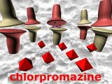 Antipsychotic drugs such as chlorpromazine are thought to exert their therapeutic effects by blocking DA receptors. Here are some images from a movie showing this effect of chlorpromazine on postsynaptic receptors. Notice that chlorpromazine attaches to receptor sites in the postsynaptic membrane normally occupied by dopamine released from the presynaptic neuron. This prevents dopamine activating these receptors and consequently the postsynaptic neuron does not fire.