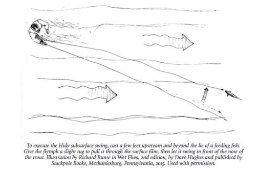 "... you want the line to draw the flymph in a slow arc right across the bow of the rising trout. (Hidy 1979). Sawyer lifted his rod to raise the nymph towards the surface. In contrast, Kite and Hidy's technique introduces lateral as well as vertical movement to represent the behaviour of a natural nymph reported by Mottram (Lawton 2005 p45).