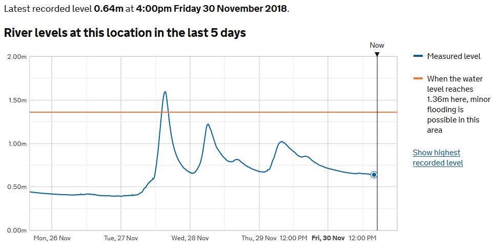 wind, occasional sunny intervals. Water height 0.35m, water still carrying
